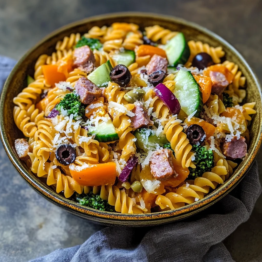 1. In a large mixing bowl, combine the cooked pasta, diced vegetables, chopped meats, and cheese sticks.